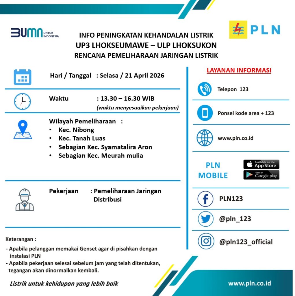 LHOKSUKON | CBNPOST— PT PLN (Persero) Unit Layanan Pelanggan (ULP) Lhoksukon menyampaikan revisi jadwal pemadaman listrik yang sebelumnya telah diumumkan dalam rangka Pemeliharaan Jaringan Listrik Tegangan Menengah 20 KV pada Selasa, 21 April 2026.