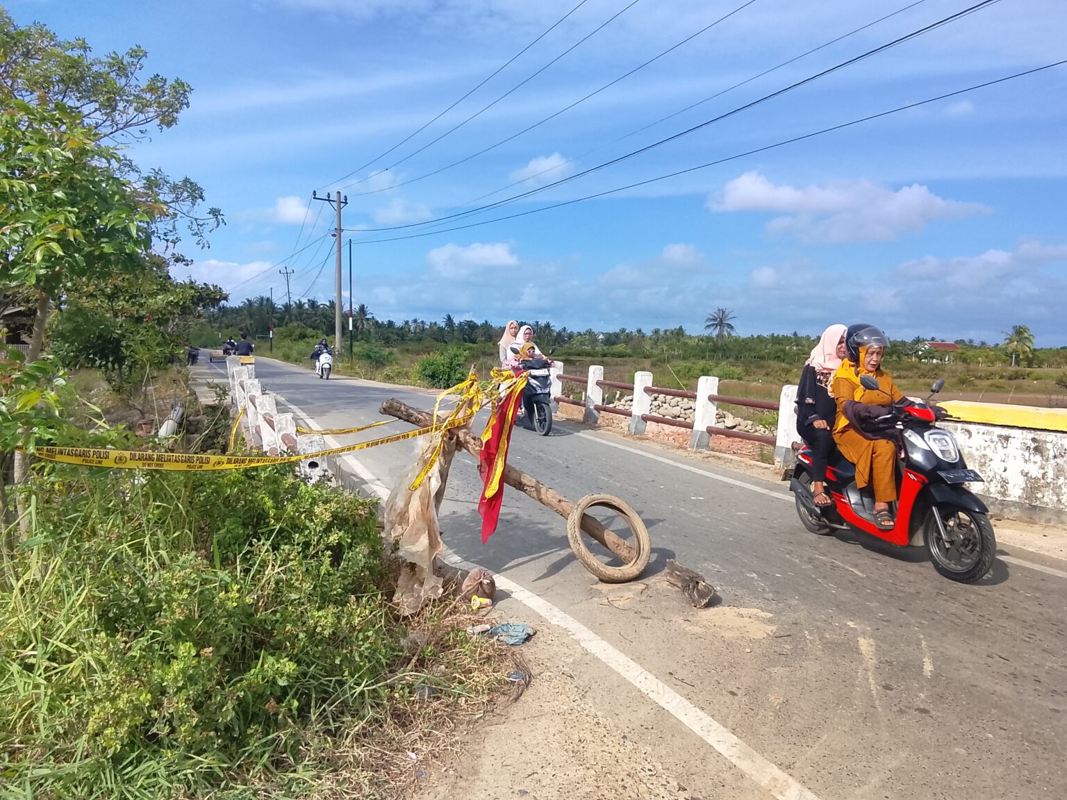 Peringatan Darurat SeadanyaUntuk mencegah jatuhnya korban, warga bersama pihak terkait memasang tanda peringatan darurat. Seutas garis polisi (police line) berwarna kuning melintang di area kerusakan. Sebuah tiang kayu panjang yang dipasangi ban bekas dan kain merah juga diletakkan di titik amblas sebagai penanda bagi pengendara agar berhati-hati.